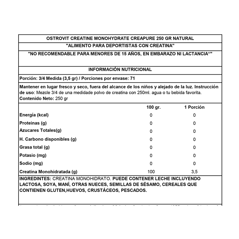 Aporte: 3/4 scoop aporta 3.5 gramos de creatina